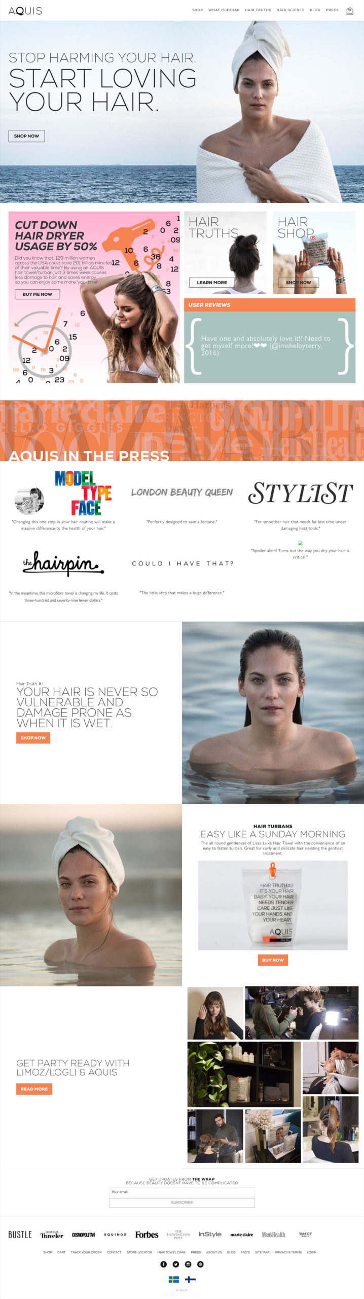 I was hired to work with a small team to redesign the Aquis, hair towel site. The existing product site did not have a clear user flow, was noisy, and lacked consistent branding (see old homepage). The biggest challenge going into this project was the timeline and scope so it was important to establish clear goals and success metrics with the client for the project.